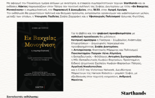 Με αφορμή την Παγκόσμια ημέρα ατόμων με αναπηρία, η εταιρεία συμπεριληπτικών τεχνών Starthands και οι εκδόσεις Κάκτος παρουσιάζουν στην Πάτρα την ποιητική συλλογή της Σοφίας Δευτερίγου με τίτλο «Εκ Βακχείας Μονογένεση» η συμπεριληπτική, την Παρασκευή 5 Δεκεμβρίου, στις 18:30, στην Αγορά Αργύρη. Για το βιβλίο και την ψηφιακή προσβασιμότητα με καθολική προσέγγιση θα μιλήσουν μεταξύ άλλων, η αξιότιμη Αντιπρύτανις Φοιτητικής Μέριμνας και Πολιτισμού Πανεπιστημίου Πατρών κυρία Ελ. Αλμπάνη. Την εκδήλωση θα χαιρετίσουν πολιτικά και θεσμικά πρόσωπα, εκπρόσωποι οργανισμών και ωφελούμενων μελών, μεταξύ των οποίων, η Υπουργός Παιδείας Σοφία Ζαχαράκη και ο Υφυπουργός Πολιτισμού Ιάσωνας[...]