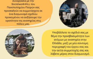 Διαγωνισμός σχεδίου, με τίτλο «Ζωγραφίζω-Αποστιγματίζω», πραγματοποιείται από την Περιφερειακή Ενότητα Ατόμων με Αναπηρία Δυτικής Ελλάδας και Ιονίων Νήσων (στο εξής Π.ΟΜ.ΑμεΑ), σε συνεργασία με την ομάδα SocialWork4All και το Πανεπιστήμιο Πατρών. Σκοπός του διαγωνισμού είναι να γίνουν περισσότερο ορατές οι αναπηρίες μέσα στην καθημερινότητα στον αστικό ιστό. Τα άτομα με αναπηρία έχουν δικαίωμα στην προσβασιμότητα και την ισοτιμία των ευκαιριών σε όλους τους τομείς της ζωής, τόσο όσον αφορά την υλική και φυσική δομή μιας πόλης, όσο και στο να εκπαιδεύονται, να απολαμβάνουν υπηρεσίες υγείας, αλλά και στην τέχνη. Όσοι ενδιαφέρονται να συμμετέχουν (τόσο[...]