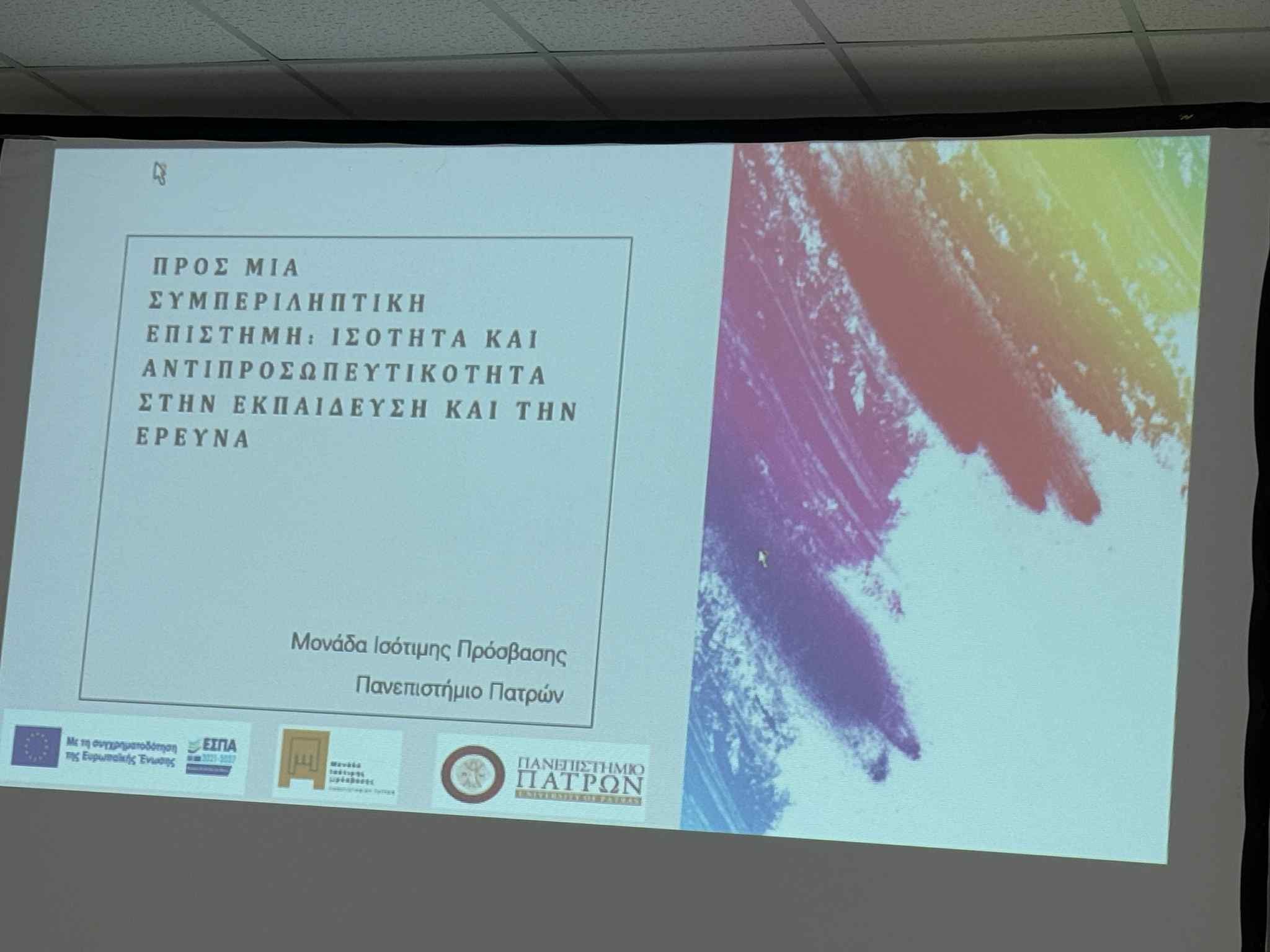 Τη Μονάδα Ισότιμης Πρόσβασης εκπροσώπησαν η Ψυχολόγος κα Κολλύρου Μαρία και τη διερμηνεία της παρουσίασης στην Ελληνική Νοηματική Γλώσσα ανέλαβε η κα Παπαπροκοπίου Λαμπρινή.